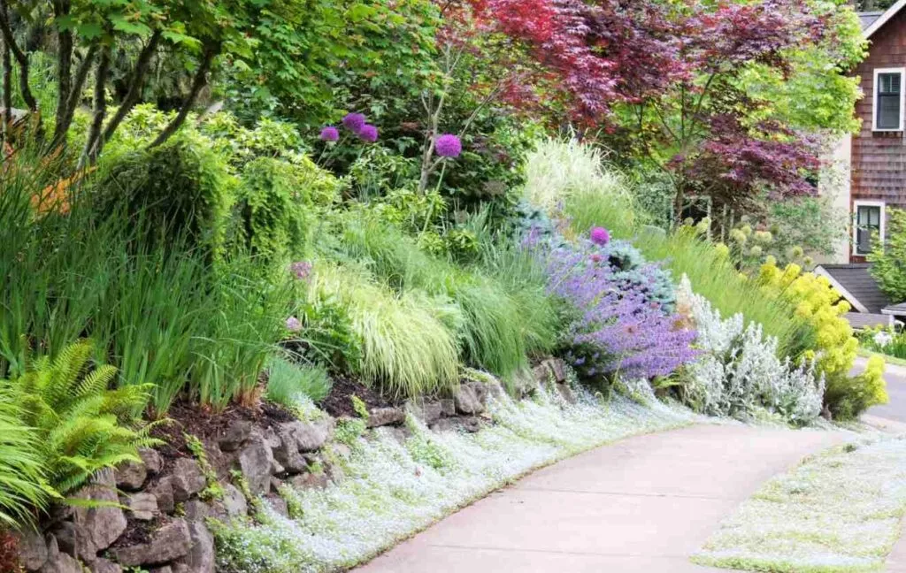 If you have a pool on your property or find yourself reclining outside regularly, choose a tropical lawn design! This design is not only amusing and welcoming, but it also adds to the friendliness of the environment. Make your exterior come alive with palm trees, vividly colored plants, and a variety of greenery.