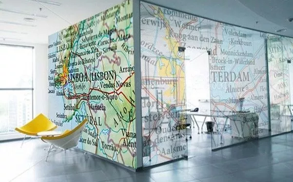 In finding a unique wall design for the office you should make a world map to hang on the convention room’s wall, but not a conventional one. You could also pin the spots to make it more interesting, similar to how this wall has a completely unique one.